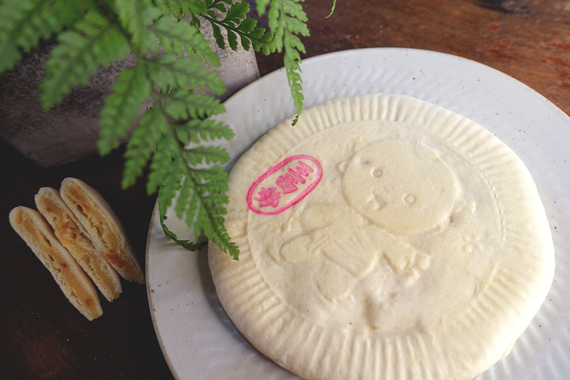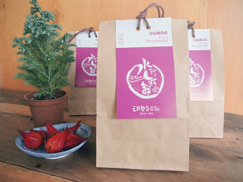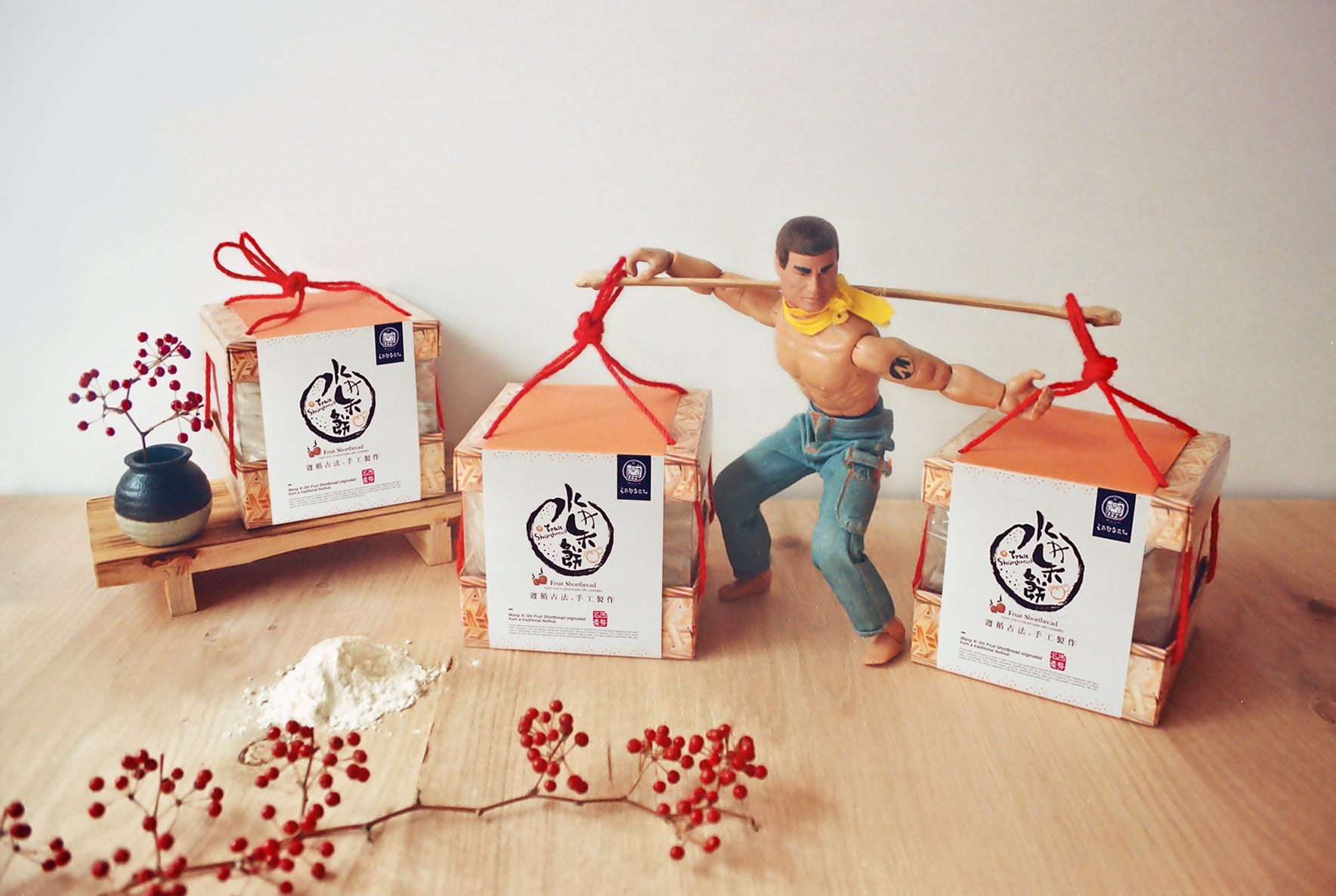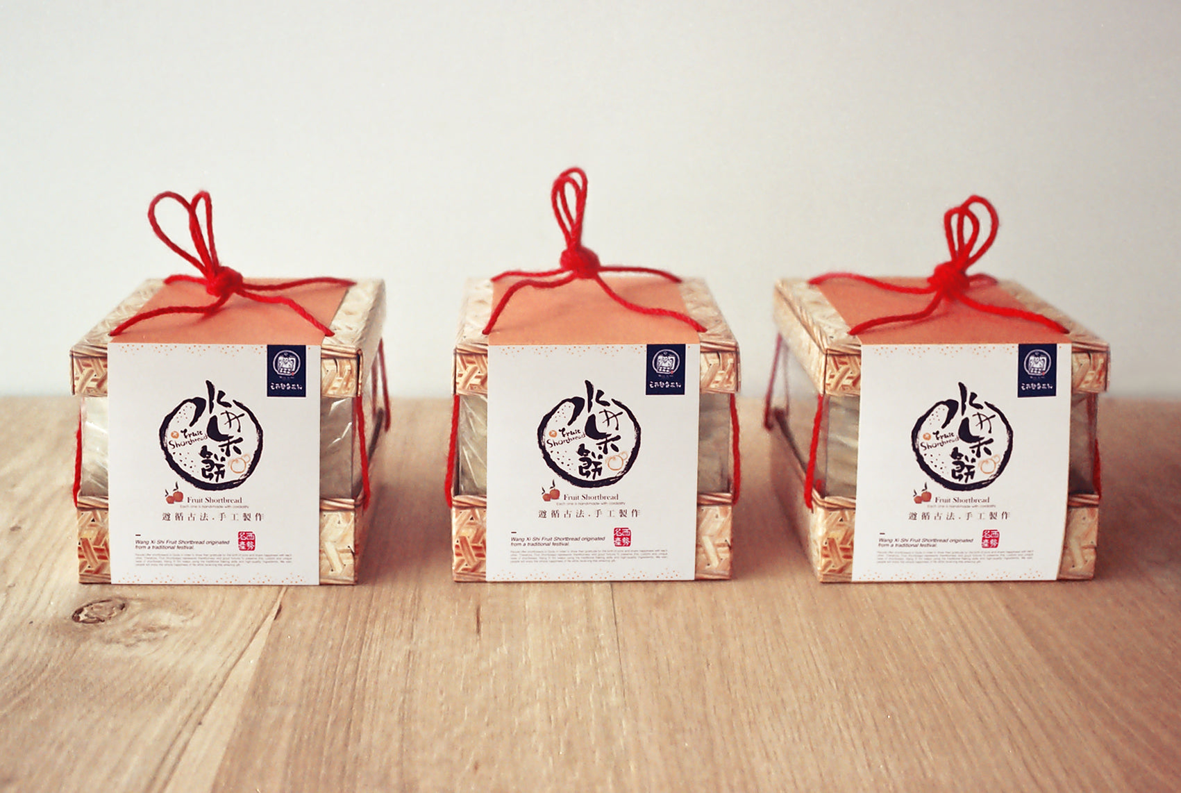 原本祈福用的水餅沒有餡料,僅有單純的麵皮味,從爺爺將橘皮加入其中並取名為【水果餅】以來,已有一甲子的歷史。第三代接手後針對現代人的口味進行調整 並將擔餅的意象融入包裝中,成為獨一無二的伴手禮。